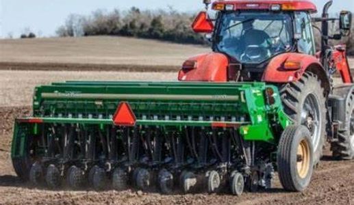 The Great Plains 12 foot end-wheel no-till drill is the perfect balance between compact verstility and large-, to production farming and food plots. This piece of equipment is designed to promote conservation by improving soil, using less water on irrigated ground, and allowing farmers to experiment with cover and alternative crops- ideally increasing profitability. The Great Plains 12 foot end-wheel no till drill is the perfect balance between compact versatility and large productivity. This unit is designed for seeding in a wide variety of applications, from pasture renovation and mine reclamation, to production farming and food plots. The no-till drill features a modular design, which allows three different seeds to be planed at separate rates and different depths at the same time, and a four-speed gearbox that gives producers the option to set planting rates for a variety of seeds.